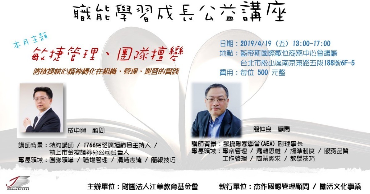 本月主題課程,江華教育基金會特別邀請兩位在敏捷方法及專案管理有豐富實務的講師,課程設計不僅擺脫厚重理論框架,更藉由活動演練與引導來體驗敏捷核心精神,最終透過討論與反思了解如何將敏捷觀念在組織、管理、運營的轉化實踐,協助學員了解敏捷核心觀念與架構,進而提升團隊擅變能力。